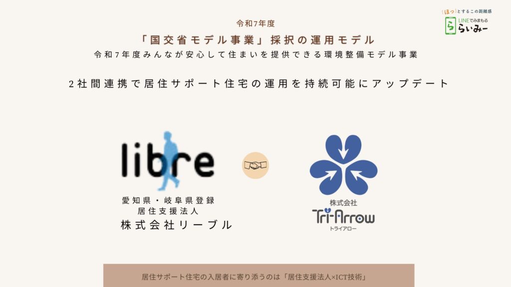 こうした現場課題に対し、株式会社Tri-Arrowは、県指定の「居住支援法人」である株式会社リーブルと業務提携し、制度要件を“現場で回る形”に落とし込む先進的な運用モデルを構築しました。株式会社リーブルは、様々な理由で住居の確保に困った方への住まいの支援に加え、生活上のお困りごとの支援も担う専門組織として、愛知県・岐阜県を中心に活動されています。